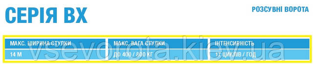 BХ — оптимальне рішення для відкатних воріт середніх розмірів. Завдяки чудовим функціональним характеристикам і високому рівню безпеки обладнання цієї серії може застосовуватися і на громадських, і на приватних житлових об'єктах. Асортимент виробів цієї серії представлений чотирма моделями, розрахованими на ~ 230 В, і двома моделями ВХV-400 і BXV-800, що працює від 24 В (інтенсивність використання 70%)