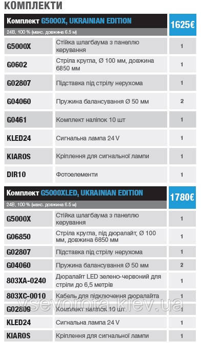 * Можлива комплектація шлагбауму дюралайтом (світлодійна підсвітка стріли, потрібна комплектація стрілою артикул G06850 + 120 Євро до вартості базового комплекту шлагбаума)